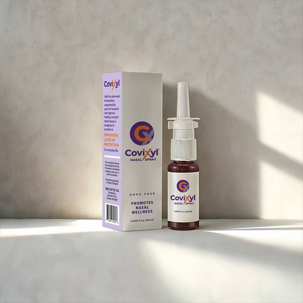 Covixyl is a new, patented protective nasal spray that helps to enhance the health of your nasal passages. The nose is the primary entry point to the body for airborne contaminants and Covixyl's ultra-fine mist creates a physical barrier in the nose that prevents attachment to the nasal cells.